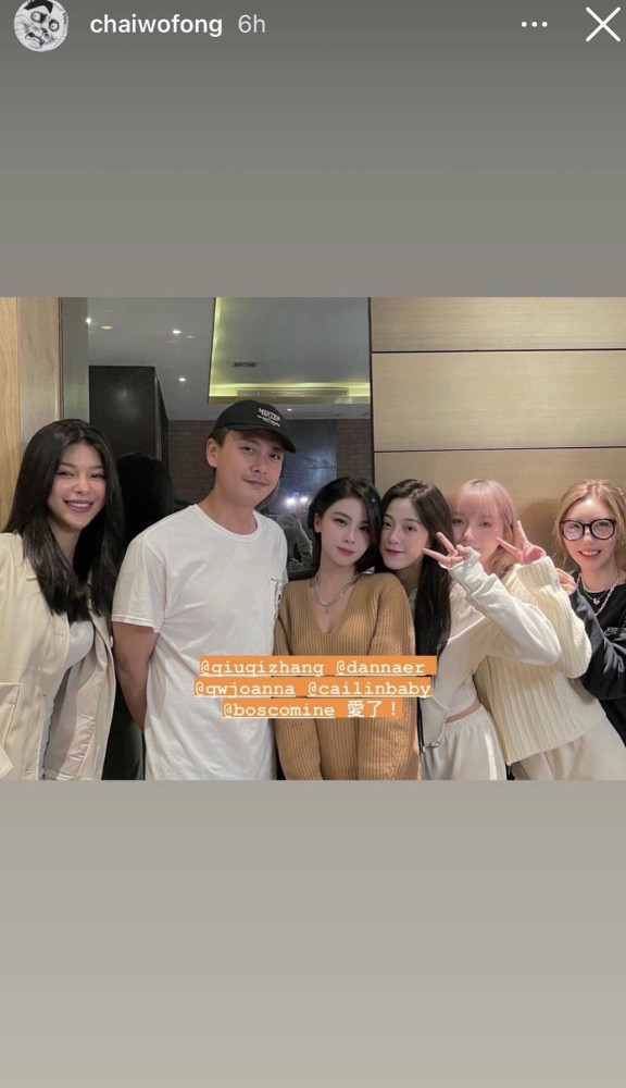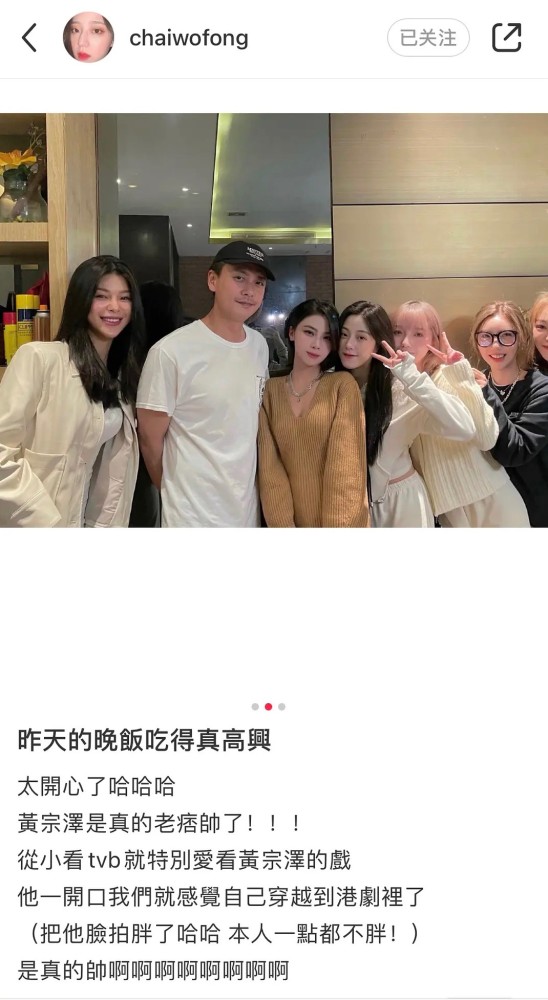 照片中的黃宗澤身著白色T恤,戴著黑色鴨舌帽笑意盈盈,雙手背後穩站C位,被五位大美女簇擁。 仔細看他和旁邊的女生靠的很近,這位美女的老公與苗僑偉是親戚,所以經常帶著姐妹團與TVB的演員一起吃飯。